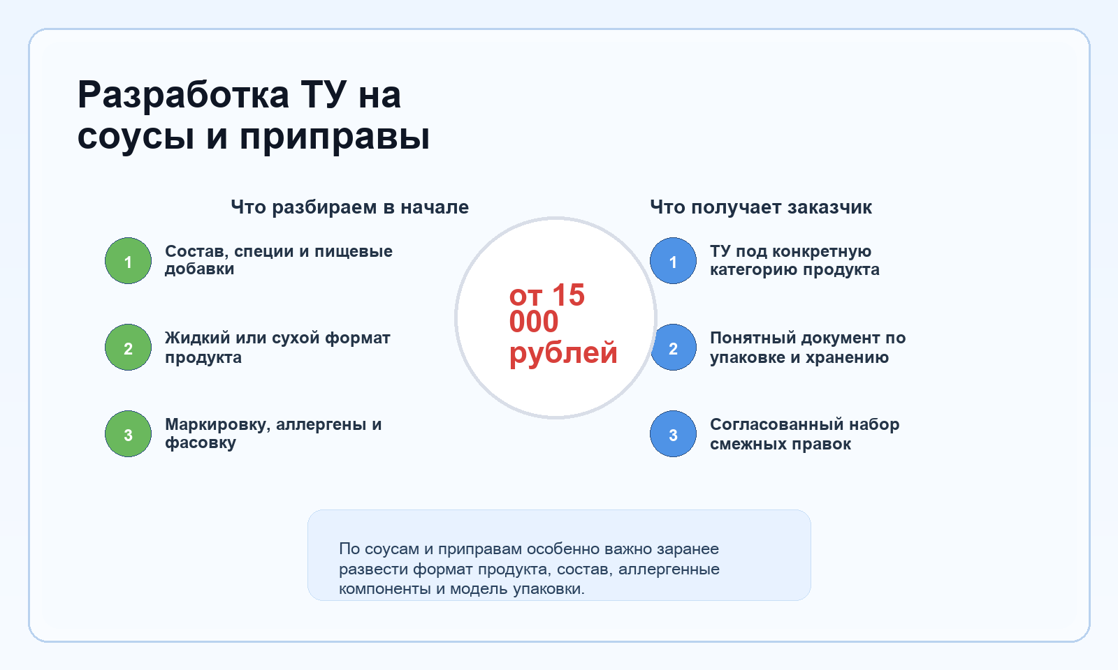 Присылайте перечень соусов или приправ, которые нужно включить в документ, и хотя бы одну актуальную рецептуру. Этого хватает, чтобы быстро определить границы проекта и составить понятный стартовый план.